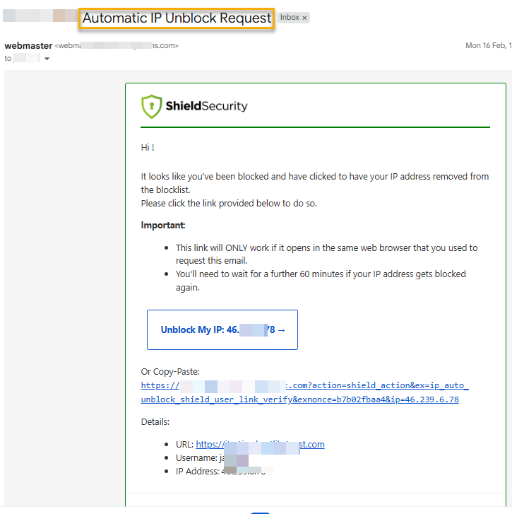 When your logged-in site users get blocked by Shield, they'll just need to click for sending auto-unblock link to their email address:
