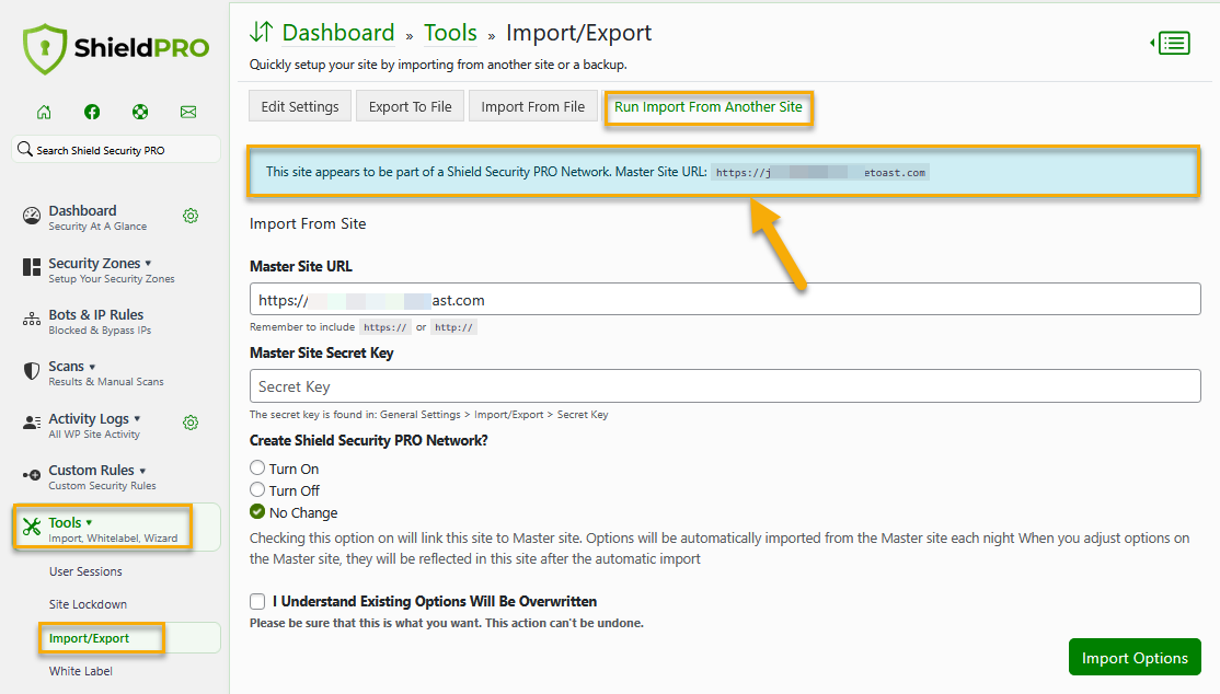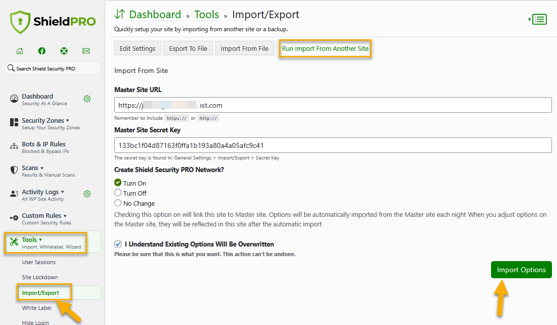 5) Click the "Import Options" button and all Shield options will be imported to your slave site within seconds.