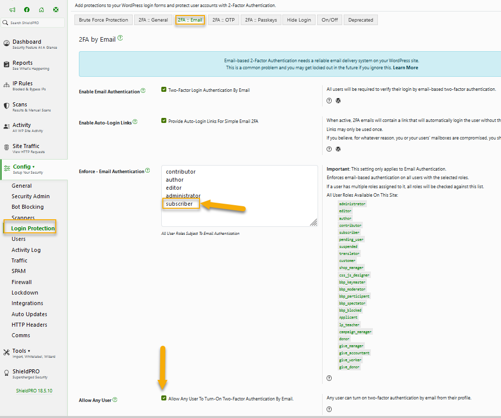 Important: If you leave 'subscriber' user role on the list, they'll be enforced for email-2A. This means that they'll not have the ability to decide whether they want to use it for their user account or not.