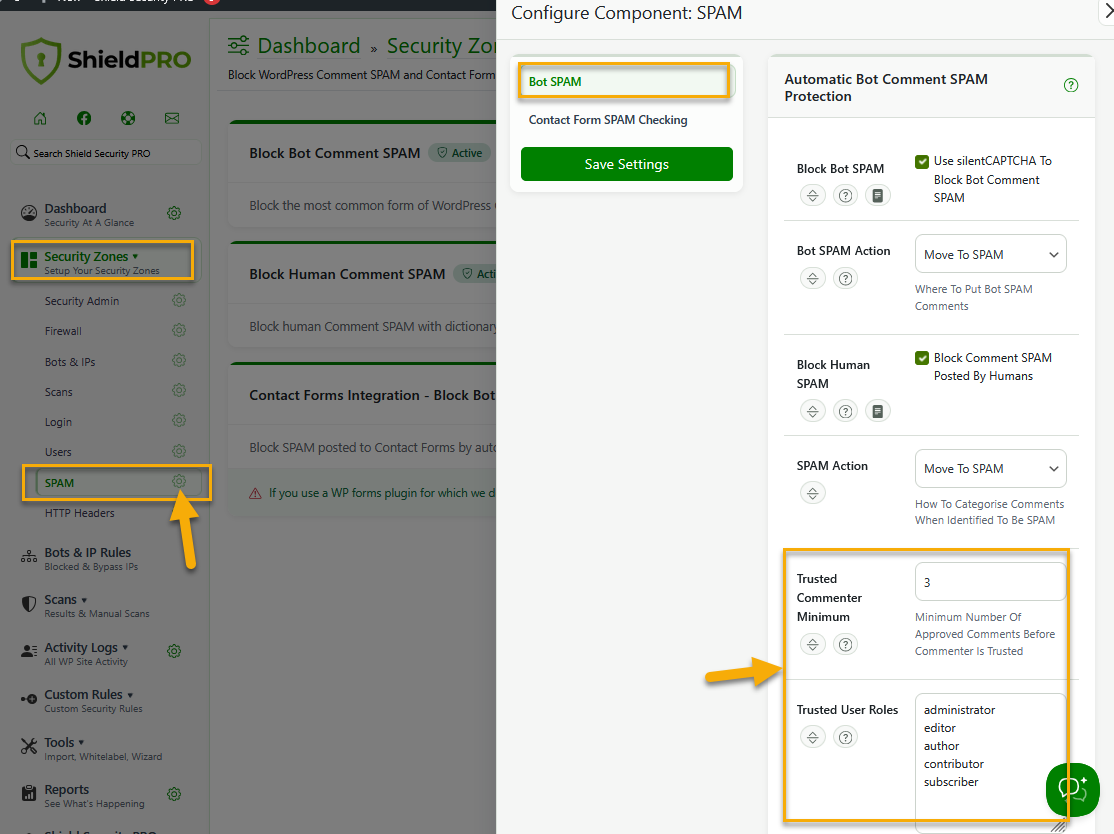 Just go to the main Security Zones navigation menu and when you click gear icon next to SPAM zone to edit settings for this entire Zone, a configuration sidebar window will open up for you. Then, select Bot SPAM tab and set the the minimum number of approved comments before commenter is trusted and list the trusted user roles.
