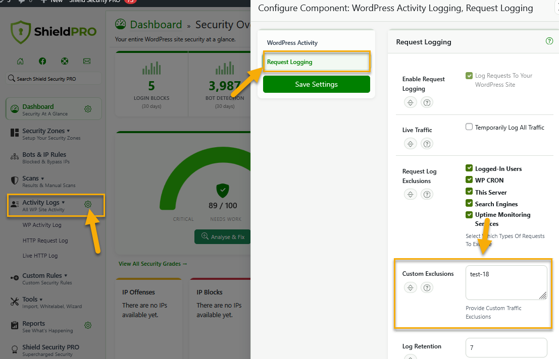 We enter test-18 into the Custom Exclusions field located under the main navigation menu > Activity Logs section > click to edit general plugin settings (gear icon) > Request Logging tab. (see the screenshot below)