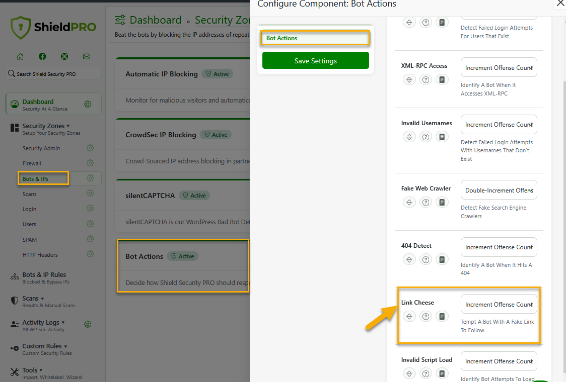 To capture bad bots is a simple matter of switching on the Link Cheese option under the Bots & IPs Zone > Bot Actions component configuration (see the screenshot below) and Shield will take care of the rest. When enabled Shield Security will: