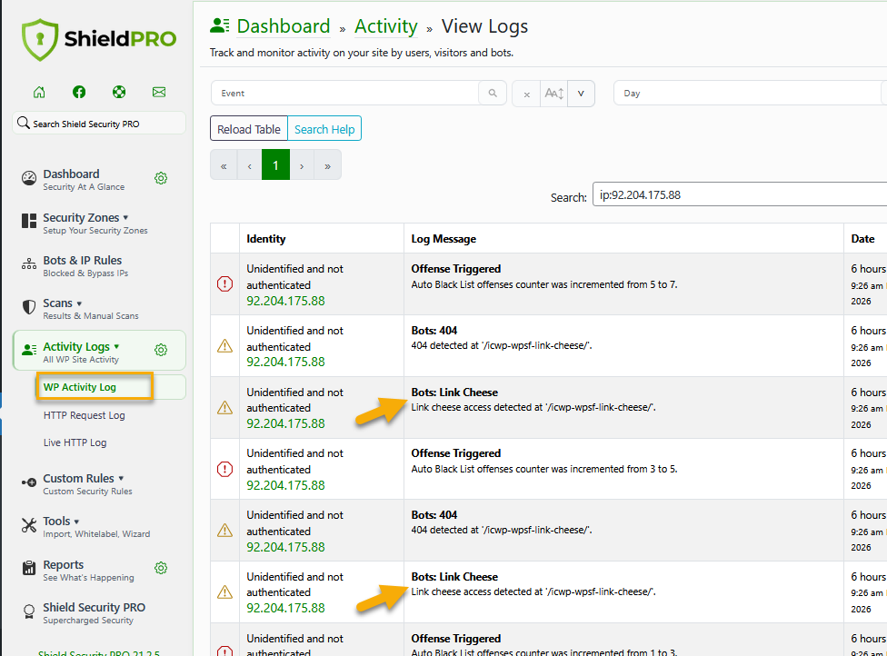 Each link cheese access detected will be recorded with the WP Activity Log, for example: