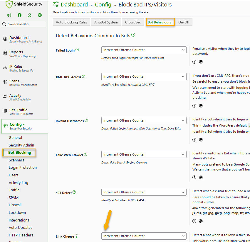 To capture bad bots is a simple matter of switching on the option and Shield will take care of the rest. When enabled Shield Security will:
