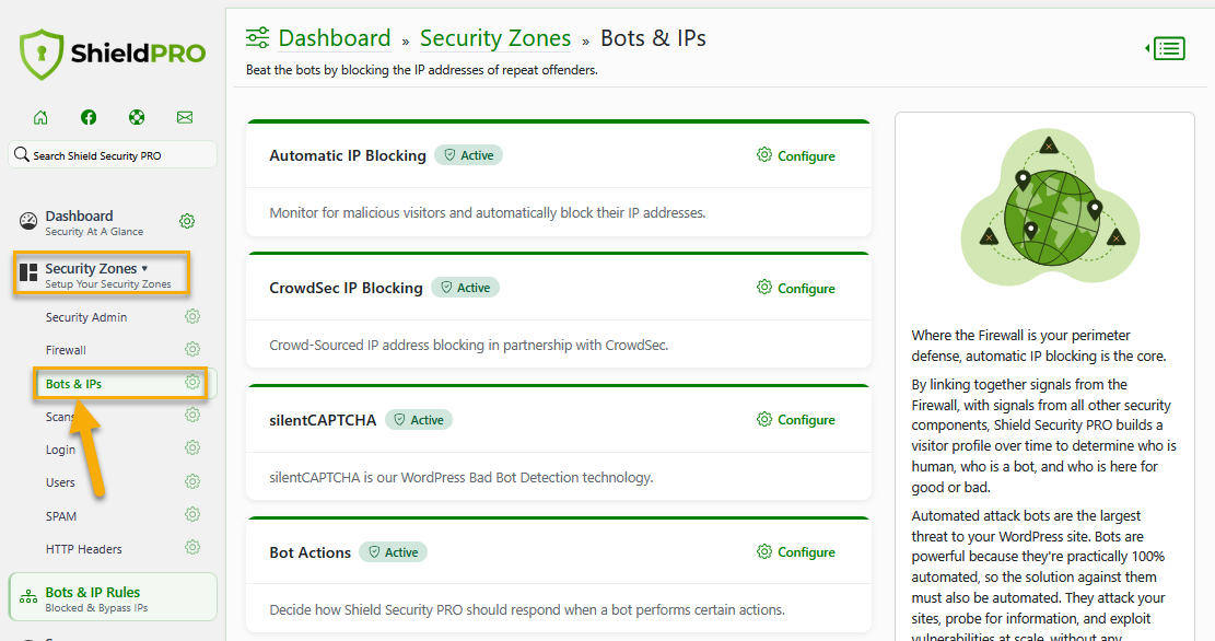 The Bots & IPs Security Zone allows you to whitelist IP addresses and configure auto-blacklist rules.