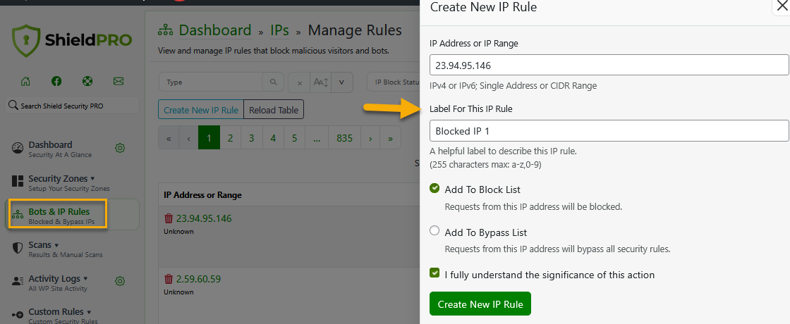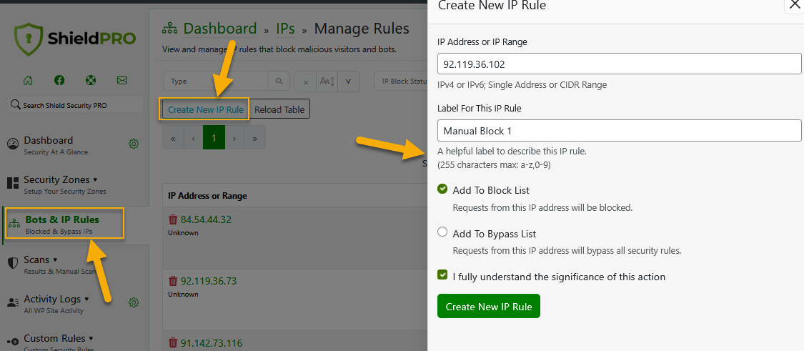 To add IP you want to block/blacklist, the easiest way is to use the "Create New IP Rule" button.