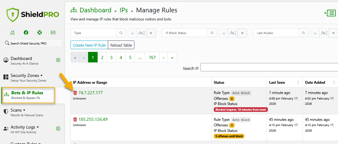 Alternatively, you can do this directly from the notice displayed at the top of the Shield admin page, or use the Search IP box to find the IP address and click to delete it. (see the screenshot below)