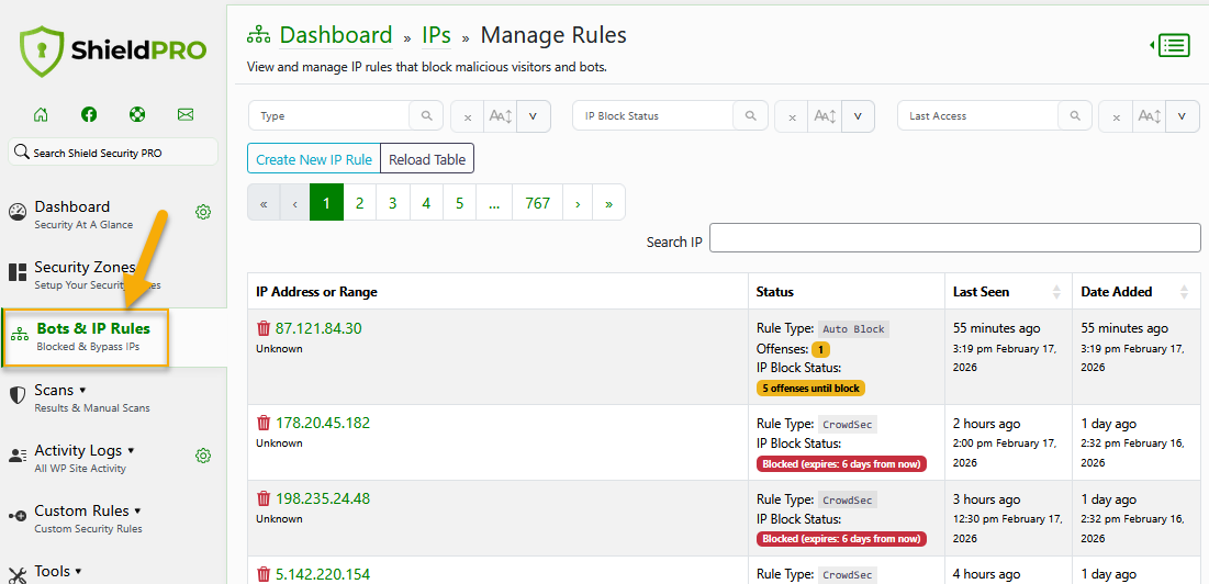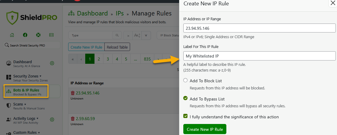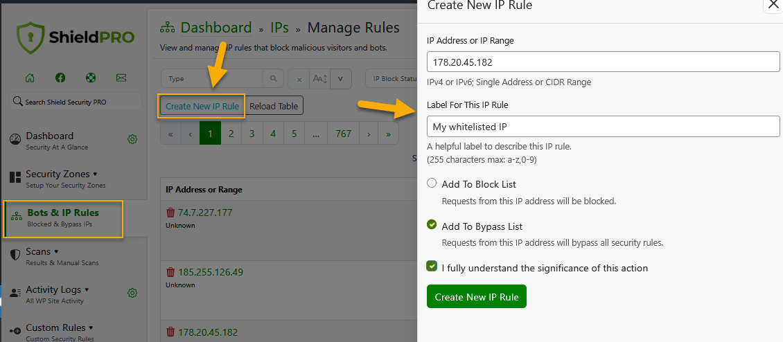 To add an IP address to the bypass/whitelist, you can follow the same process described above for blocked IPs using the “Create New IP Rule” button.