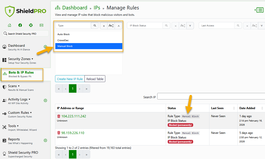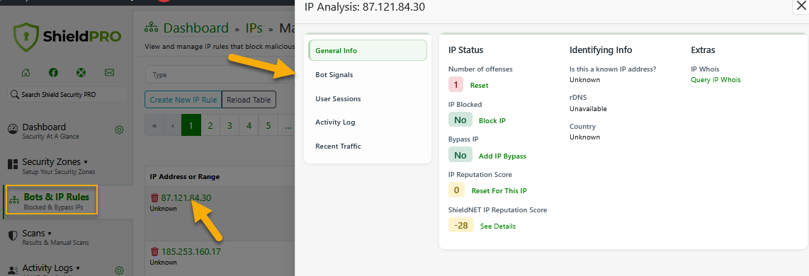 • Manage IP addresses that have tripped Shield defenses - blocked (blacklisted) IPs.