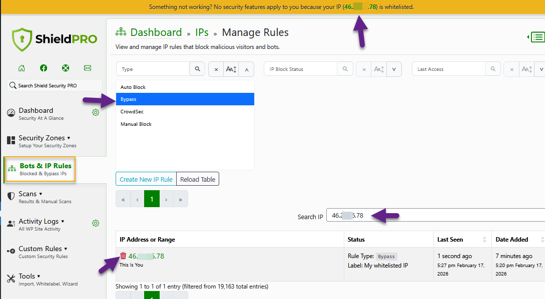 When we want to review or to manage bypassed/whitelisted IPs (IPs that are never blocked by Shield) we use the same tool as for blacklisted IPs.