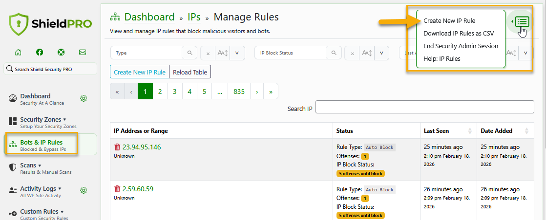 You can also access this option from the Additional Actions dropdown in the top-right corner. Select “Create New IP Rule,” then use the same form to add the IP address to the bypass/whitelist.