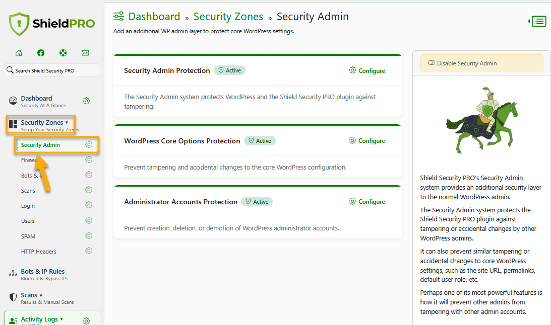 The Security Admin protects the Shield Security plugin against tampering or accidental changes by other WordPress admins.