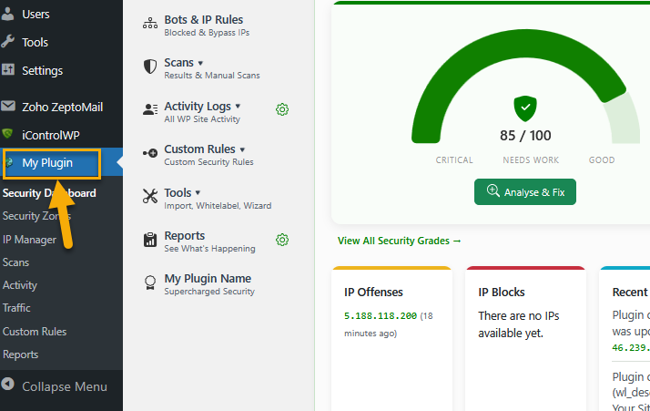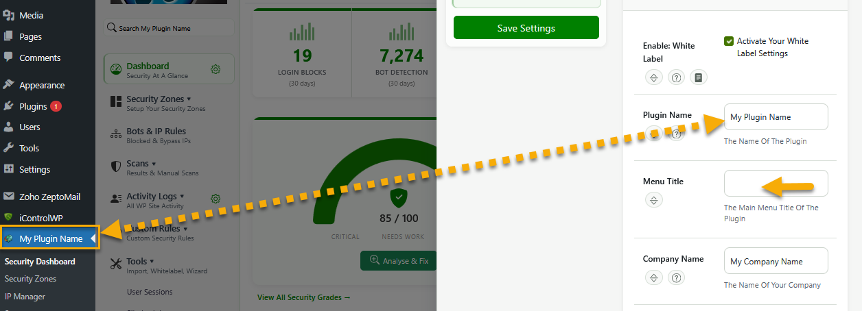For example, if you set your own menu title of the plugin to "My Plugin", "Shield" name will be replaced with "My Plugin".