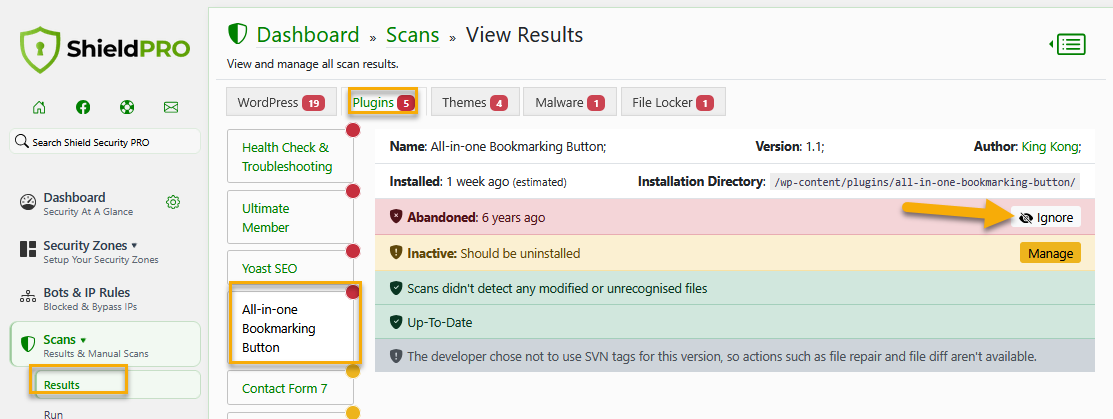 Let's say you enabled the scanner and you have the following abandoned plugin installed on your site:
