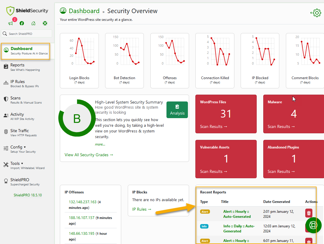 Alert reports are also accessed at any time from the Shield Dashboard (recent reports) and Reports section (list of all reports), for example: