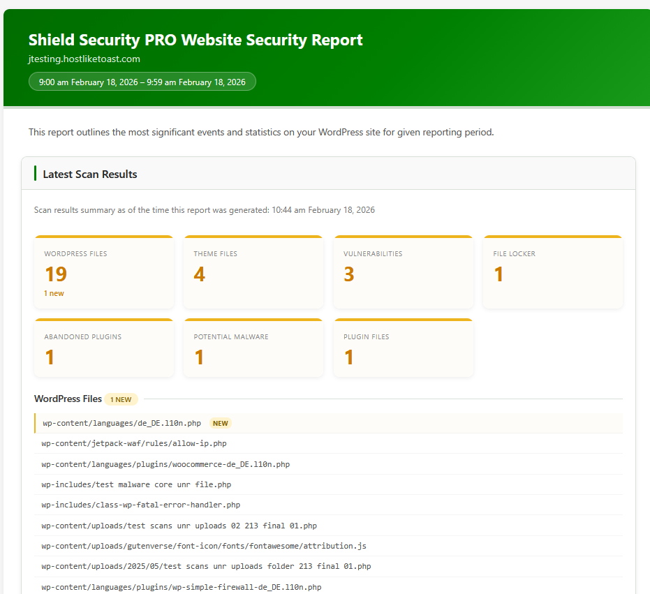 You'll get email alert report about the detected files, and email subject will be [Your Site Name] Security Report.