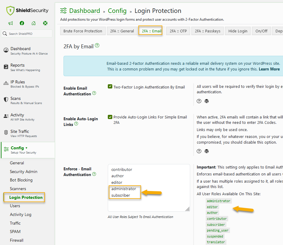 If you go to the Shield main menu > Config > Login Guard > 2FA By Email > Enforce-Email Authentication, you'll see the list of the user roles, such as contributor, author, administrator, subscriber, shop_manager, etc.