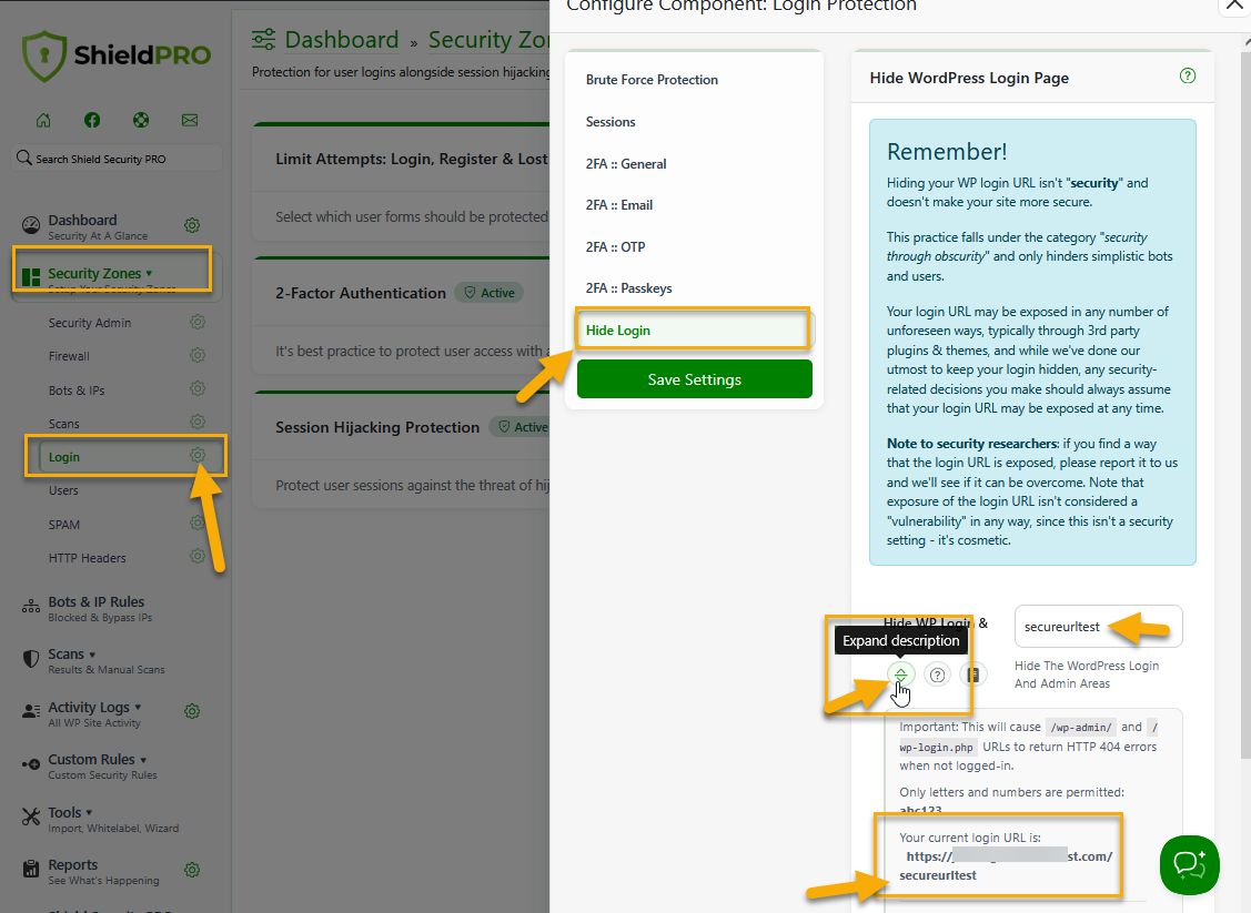Simply go to the Shield main navigation menu > Security Zones. When you click gear icon next to Login zone to edit settings for this entire Zone, a configuration sidebar window will open up for you. Then, select the Hide Login tab > Hide WP Login & Admin option and supply a string of text (only letters and numbers are permitted) and this will immediately become your new, custom login URL.