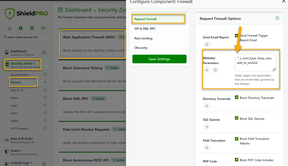 Whitelists settings - pages, parameters, and users that by-pass the Firewall