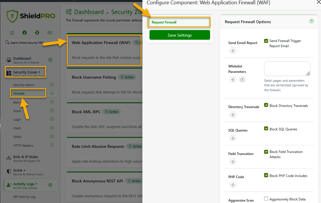 This option is located under the Shield main navigation menu > Security Zones > Firewall > click Configure (gear icon) next to Web Application Firewall (WAF) component and select Request Firewall tab.