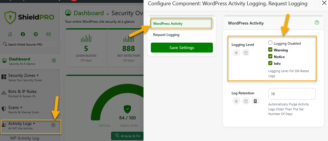Important: This will default to 7 days for Shield free users. If you want to store more logs, you’ll need to upgrade to ShieldPRO.