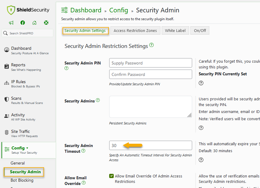 To specify the Security Admin Timeout interval, go Shield > Config > Security Admin module > Security Admin Settings > Security Admin Timeout and enter how long you want countdown time will last. Default: 30 minutes.