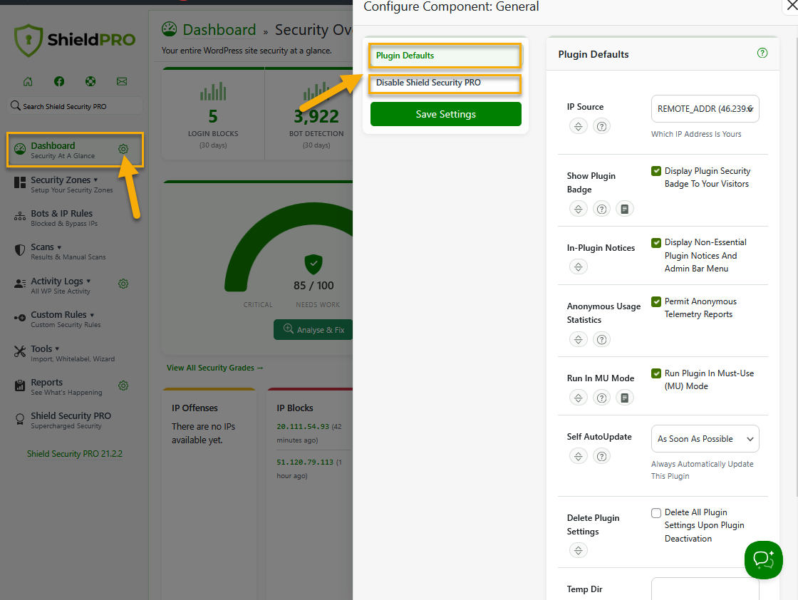 Shield Dashboard section is the most important part of the plugin - it contains options for the basic plugin settings.