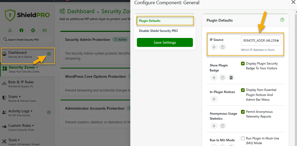 This option is accessible from within the main navigation menu > Dashboard section > click to edit general plugin settings (gear icon) > Plugin Defaults > IP Source. (see the screenshot below)