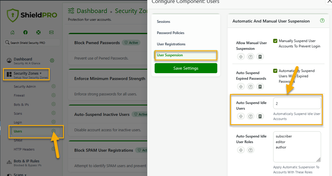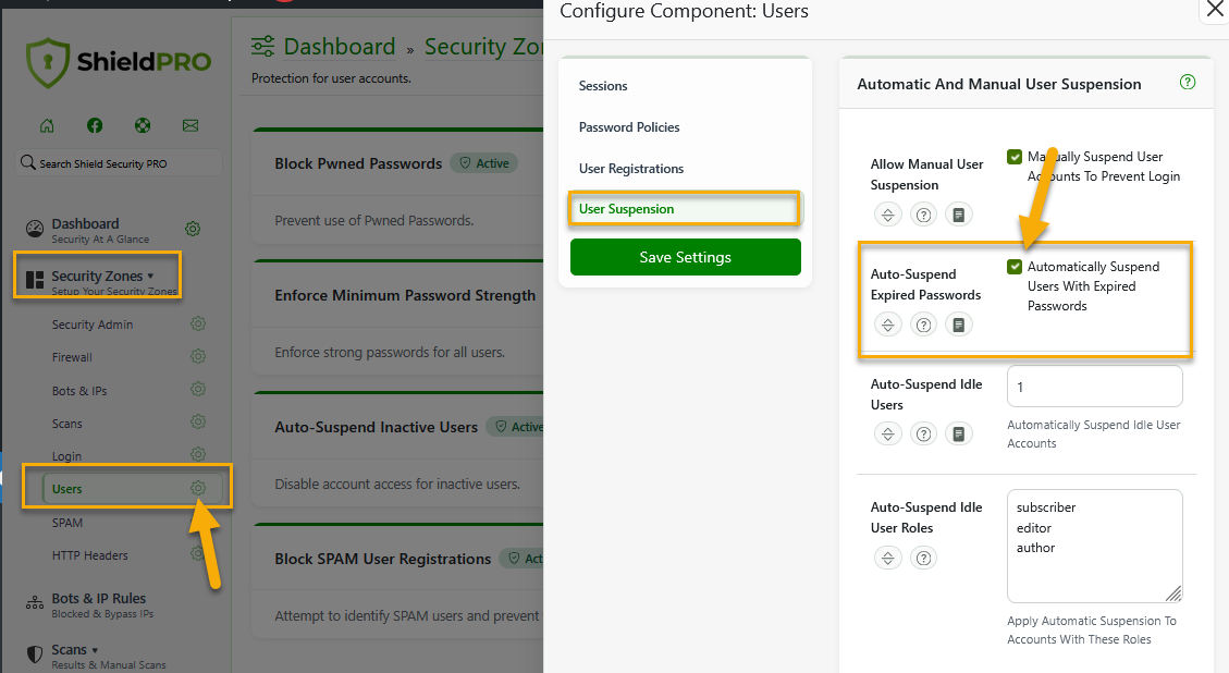 To automatically suspend WordPress users, you may go to the Shield main navigation menu > Security Zones. When you click gear icon next to User zone to edit settings for this entire Zone, a configuration sidebar window will open up for you. Then, select the User Suspension tab and enable Auto-Suspend Expired Passwords option.