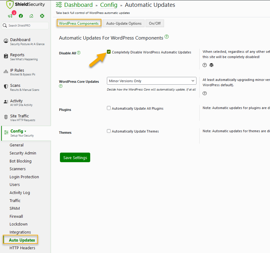 This option will completely prevent any and all WordPress Automatic Updates.