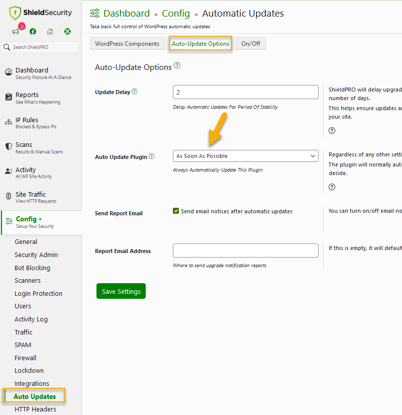 Shield Security plugin will automatically update after 2 days once the update has been detected. As some admins don't like this, we've added an option to let you control the automatic updates for the Shield plugin itself.