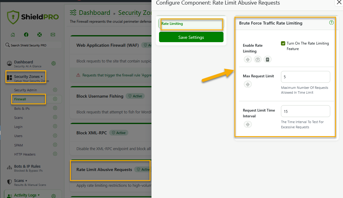 To access the options, you may go to Shield Security > Security Zones > Firewall zone. When you click Configure (gear icon) next to the Rate Limit Abusive Requests component, a configuration sidebar window will open up for you. Ensure that Rate Limiting in enabled.