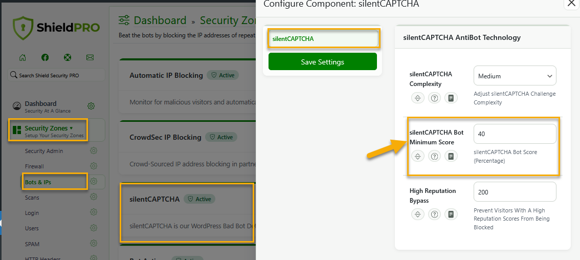 The silentCAPTCHA Bot Minimum Score option is a part of the Bots & IPs Zone: silentCAPTCHA AntiBot system. You can use it to set the bot minimum score (percentage).