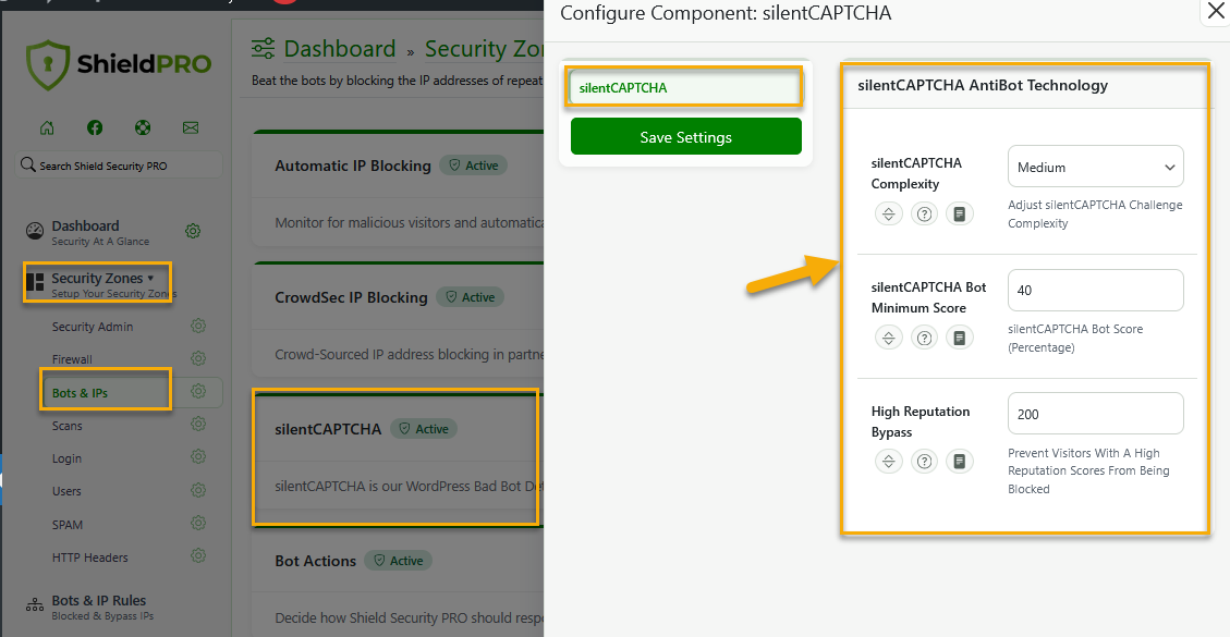 You can configure this system under the main navigation menu > Security Zones > Bots & IPs zone > click Configure (gear icon) next to silentCAPTCHA component.