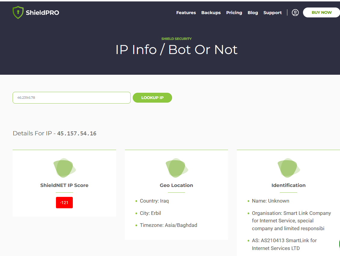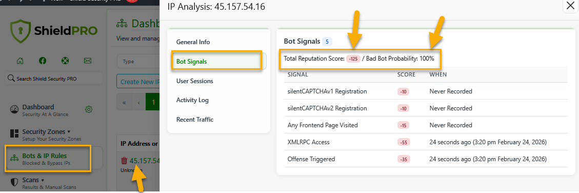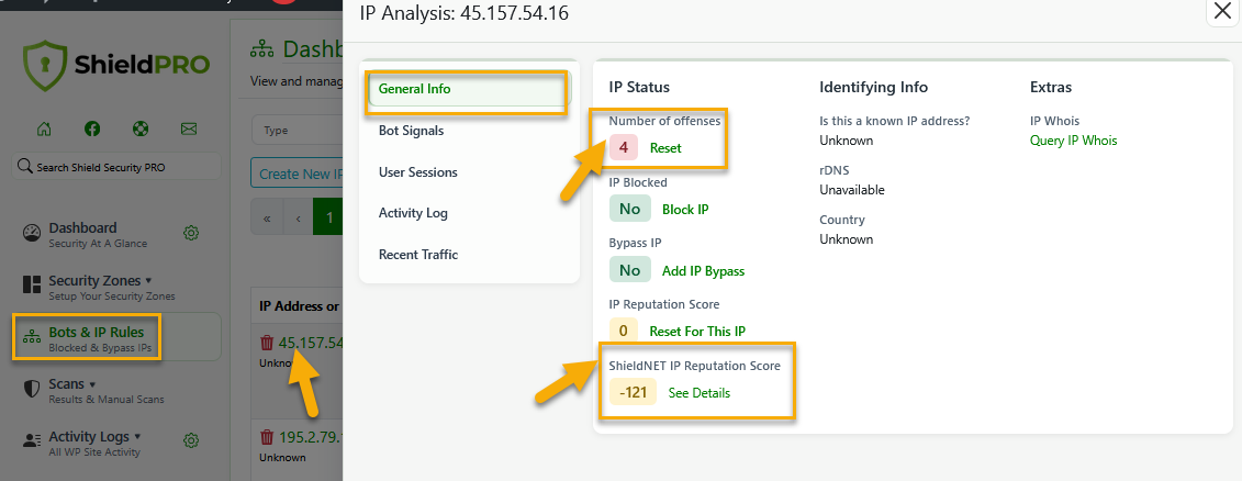 Once the IP triggers the Shield offense or get blocked entirely, the IP Analysis section will show ShieldNET IP Reputation Score. You'll also see a small link which will direct you to the bot or not info page.