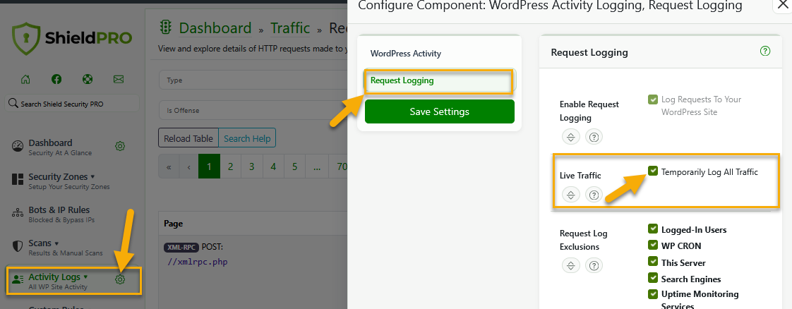 Firstly, you'll need to have the Live Traffic option activated from within the Activity Logs section > click to edit logging settings (gear icon) > Request Logging tab.