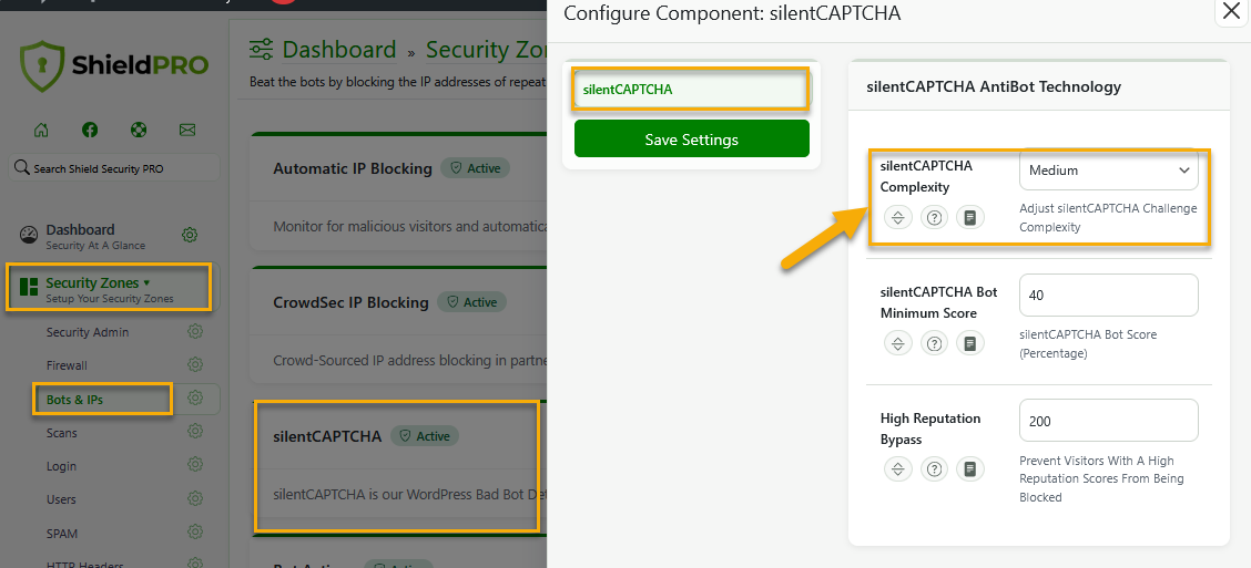 It's accessible from within the main navigation menu > Security Zones > Bots & IPs zone. When you click Configure next to the "silentCAPTCHA" component, a configuration sidebar window will open up for you. Here, you'll see all options for the silentCAPTCHA AntiBot technology, including silentCAPTCHA Complexity.