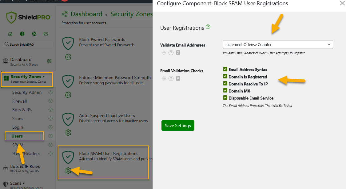 To enable it, go to Shield > Security Zones > Users Zone > click a gear icon next to "Block SPAM User Registrations" component > User Registrations. Turn on email validation and choose how the system should respond to suspicious attempts — log them, mark IPs, or block immediately.