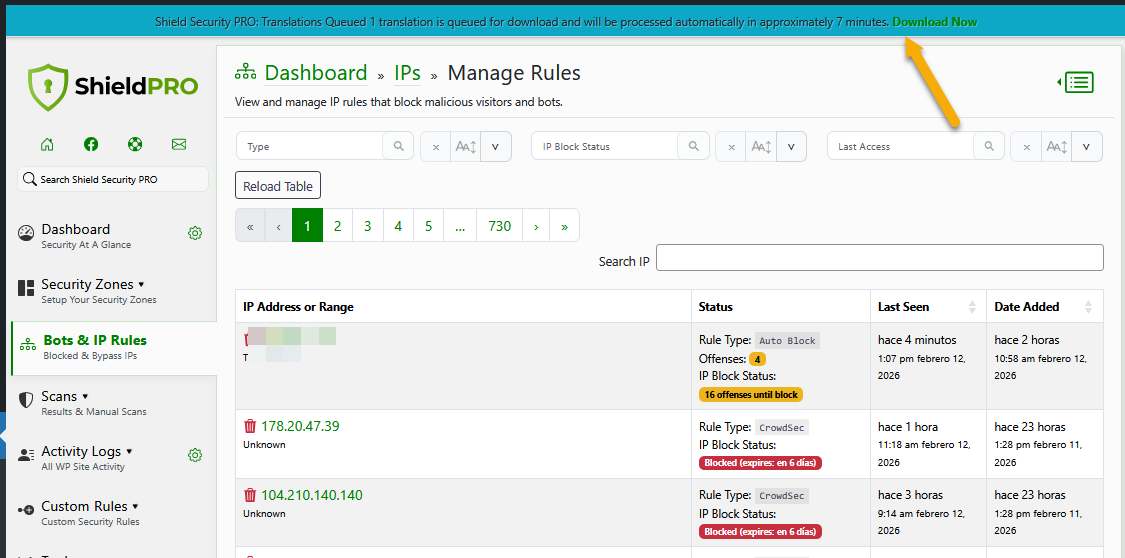 Shield now downloads translations on-demand rather than shipping them with the plugin, significantly reducing plugin size. You might see In-plugin notification for available translation downloads like in the below screenshot.