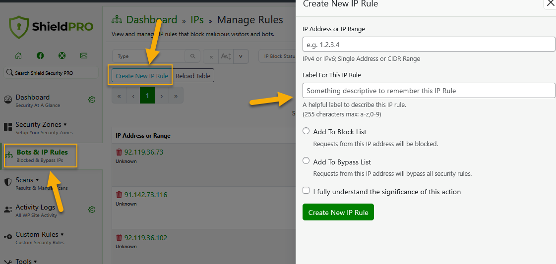We've made the "Create New IP Rule" button on the Bots & IP Rules table more visible, making it much easier to access and manage IP addresses manually. Clicking it instantly opens a form where you can add your current IP to the whitelist/bypass list, or block any IP with a single click. No more searching through settings—everything you need to whitelist or blacklist IPs manually is now right there on the table.