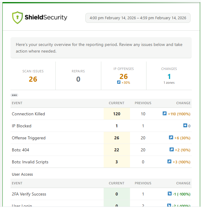 Security report emails/pages and layouts have been redesigned for improved clarity and a more professional presentation. Enhanced report emails now include richer inline statistics and more detailed scan data (including up to 20 relevant results in key sections).