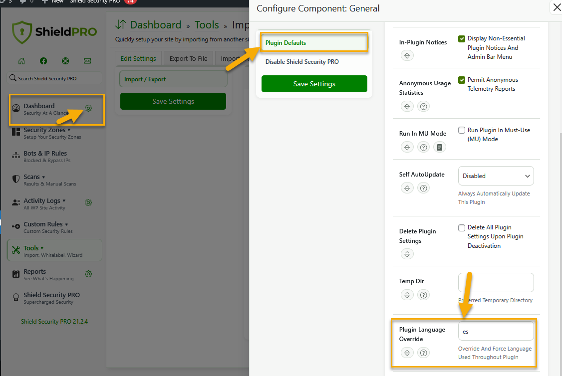 To achieve this, you just need to go to the main Shield Security navigation menu, click the gear icon next to the Dashboard section to edit the general plugin settings, then select Plugin Defaults and enter your locale in the "Plugin Language Override" option field.