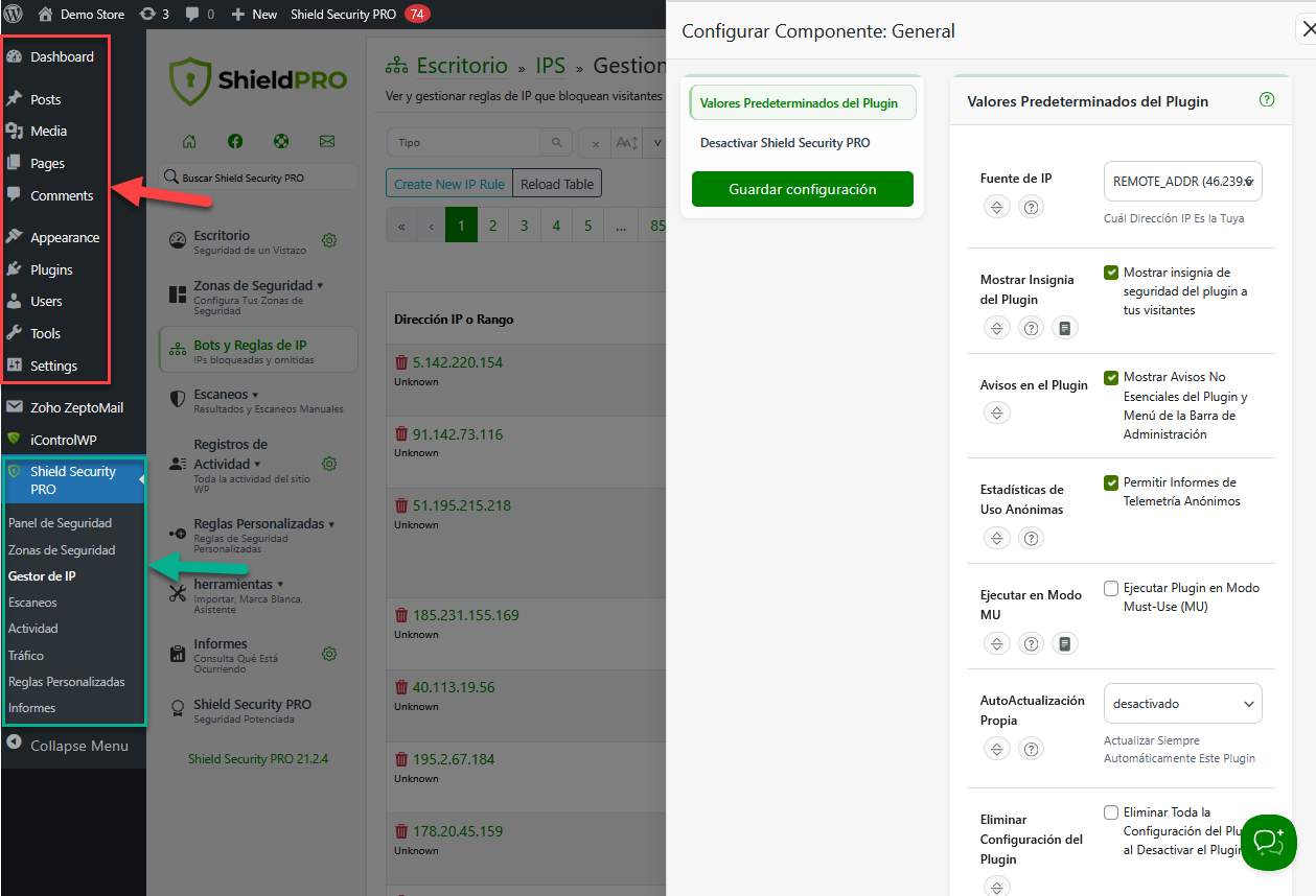 For example, if you use WordPress in English for your user profile (WordPress Dashboard > Users > Profile page > Language) but change the Shield language to Spanish, the WordPress dashboard will remain in English while the Shield plugin appears in Spanish, as shown in the screenshot below.